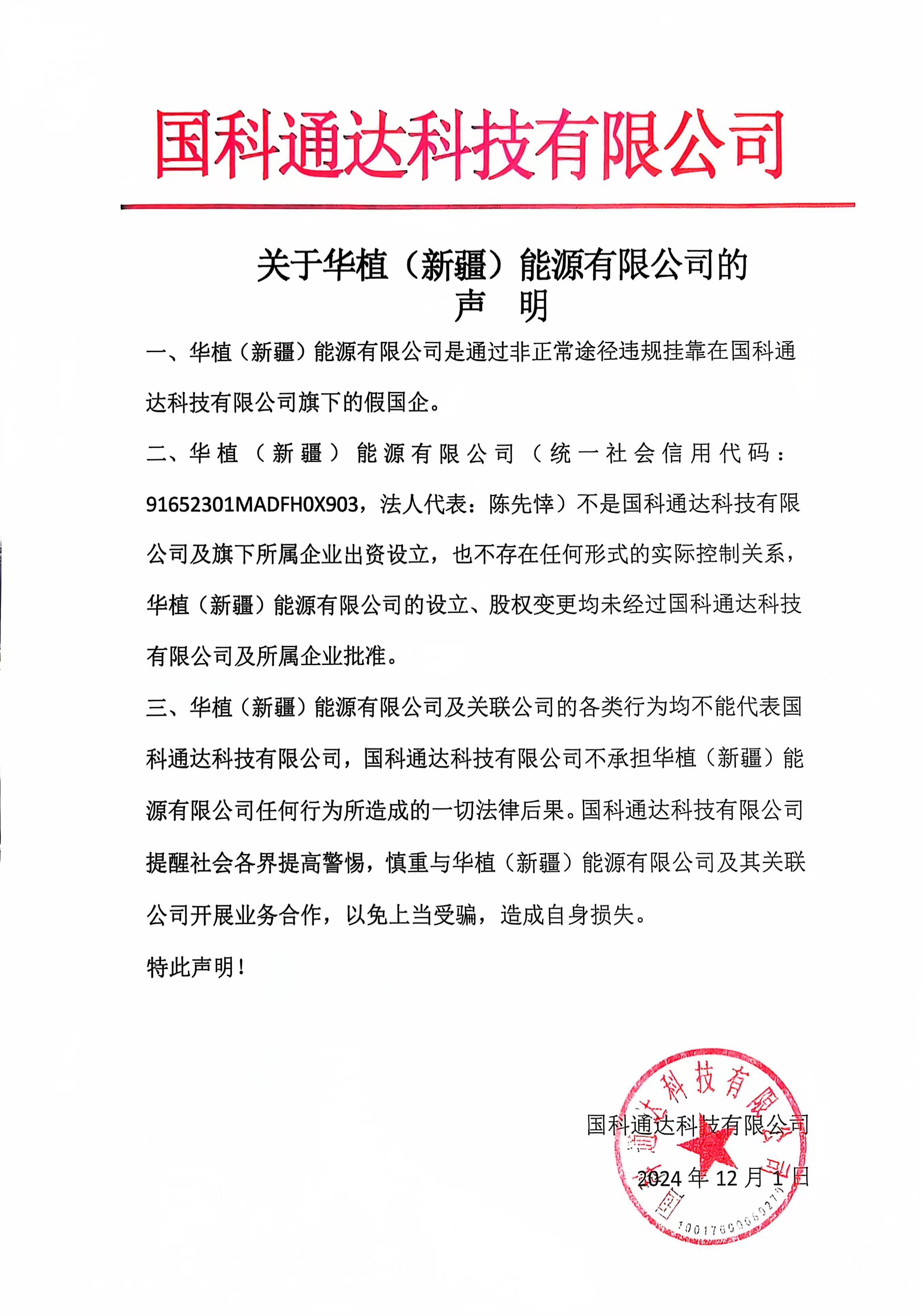 關(guān)于華植(新疆)能源有限公司的聲 明一、華植(新疆)能源有限公司是通過非正常途徑違規(guī)掛靠在國科通達(dá)科技有限公司旗下的假國企。二、華植(新疆)能源有限公司(統(tǒng)一社會(huì)信用代碼:916